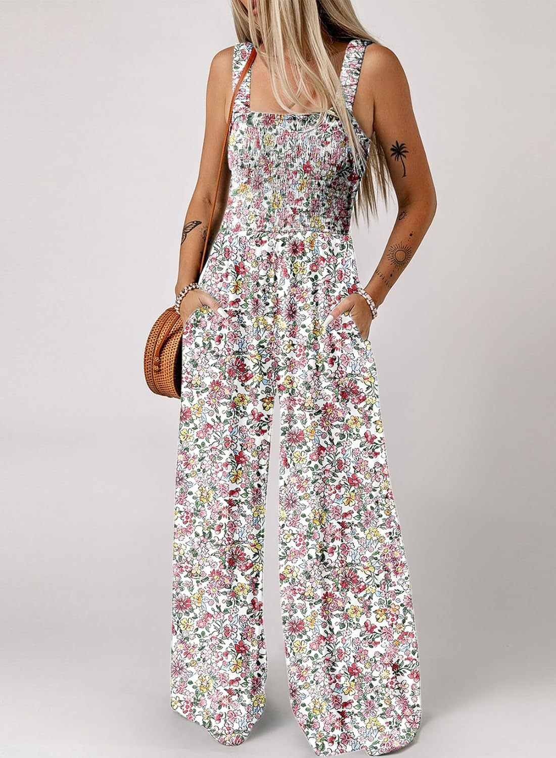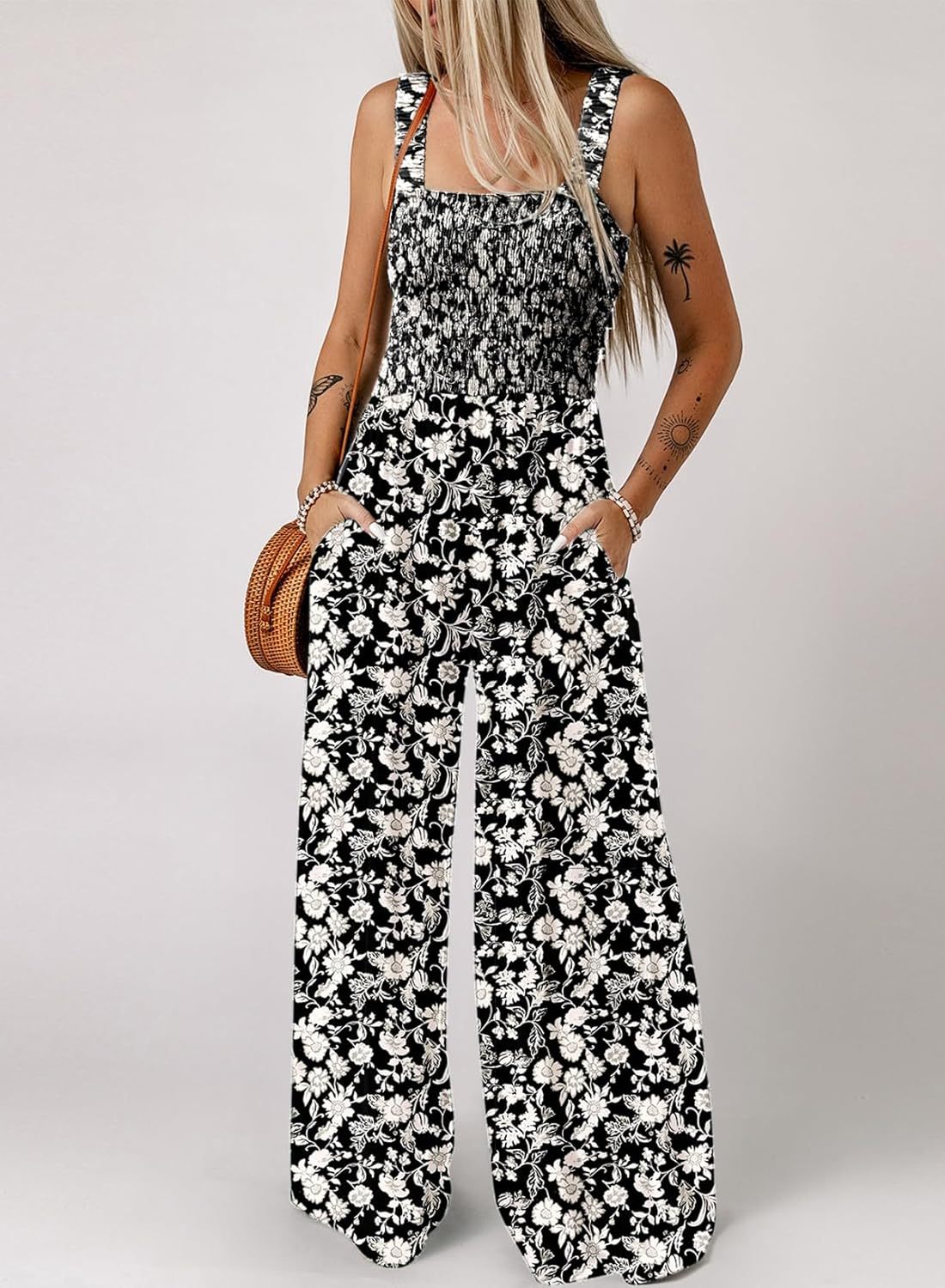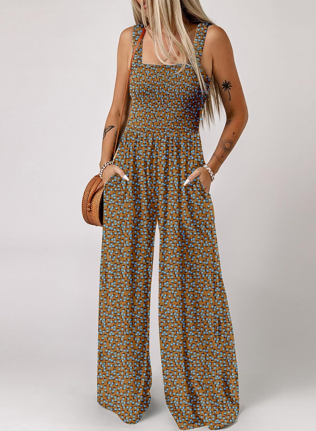 Womens Wide Leg One Piece Sleeveless Printed Jumpsuit Long Pant Rompers